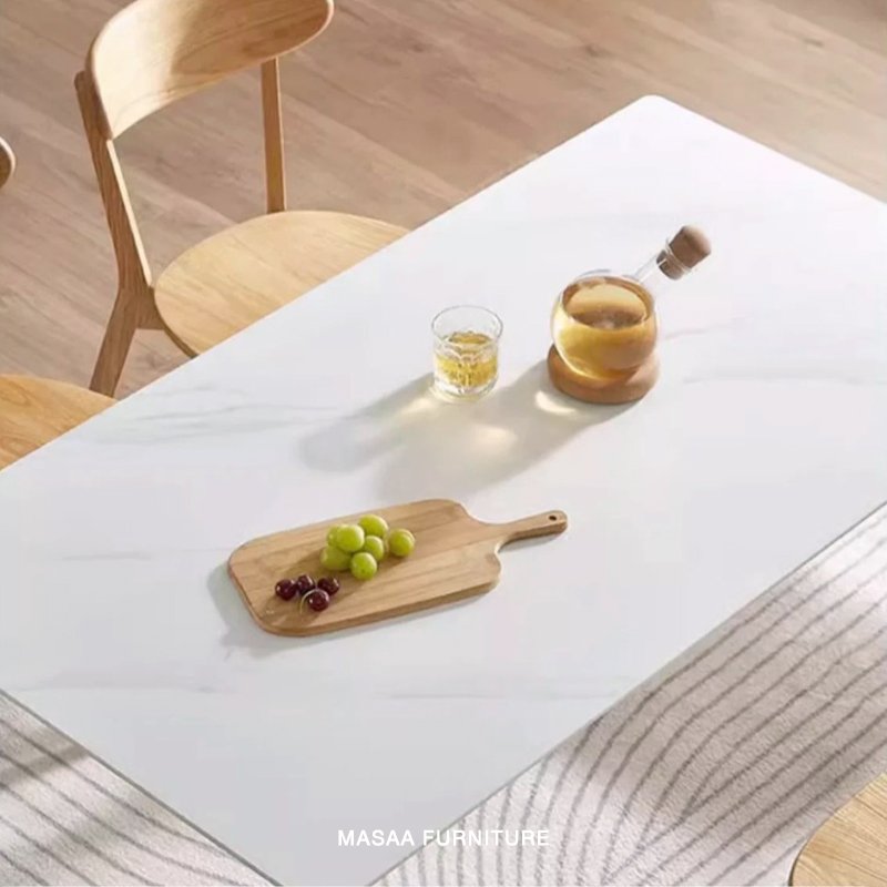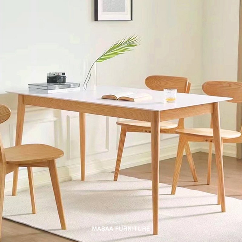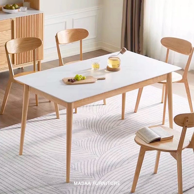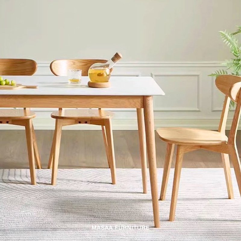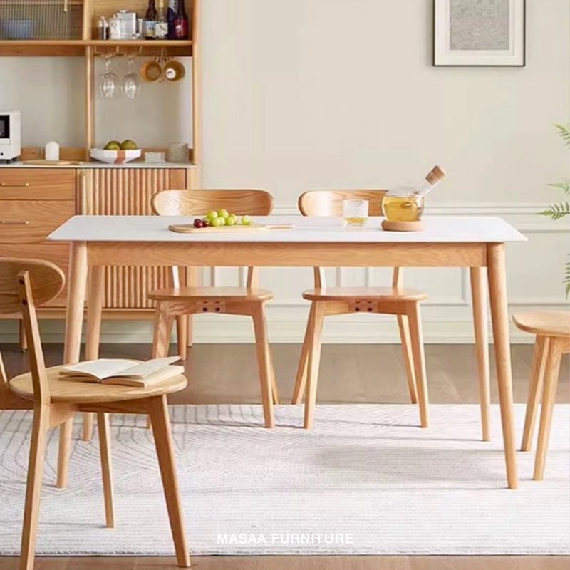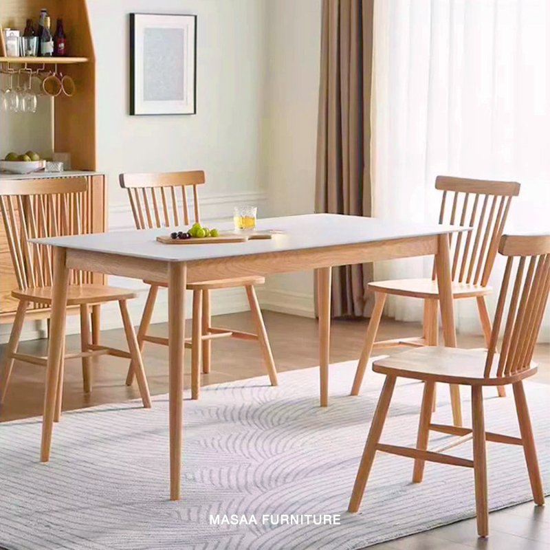ชุดโต๊ะกินข้าวไม้โอ๊ค ท๊อปหินสังเคราะห์ พร้อมม้านั่งยาวไม้โอ๊ค ขากลม ขอบโค้ง LB005 และเก้าอี้ไม้ 2 ตัว สไตล์มูจิ ญี่ปุ่น มินิมอล ประหยัดพื้นที่ เพิ่มพื้นที่ในบ้าน ทำจากไม้โอ๊ค อบอุ่น เรียบง่าย และเป็นธรรมชาติ