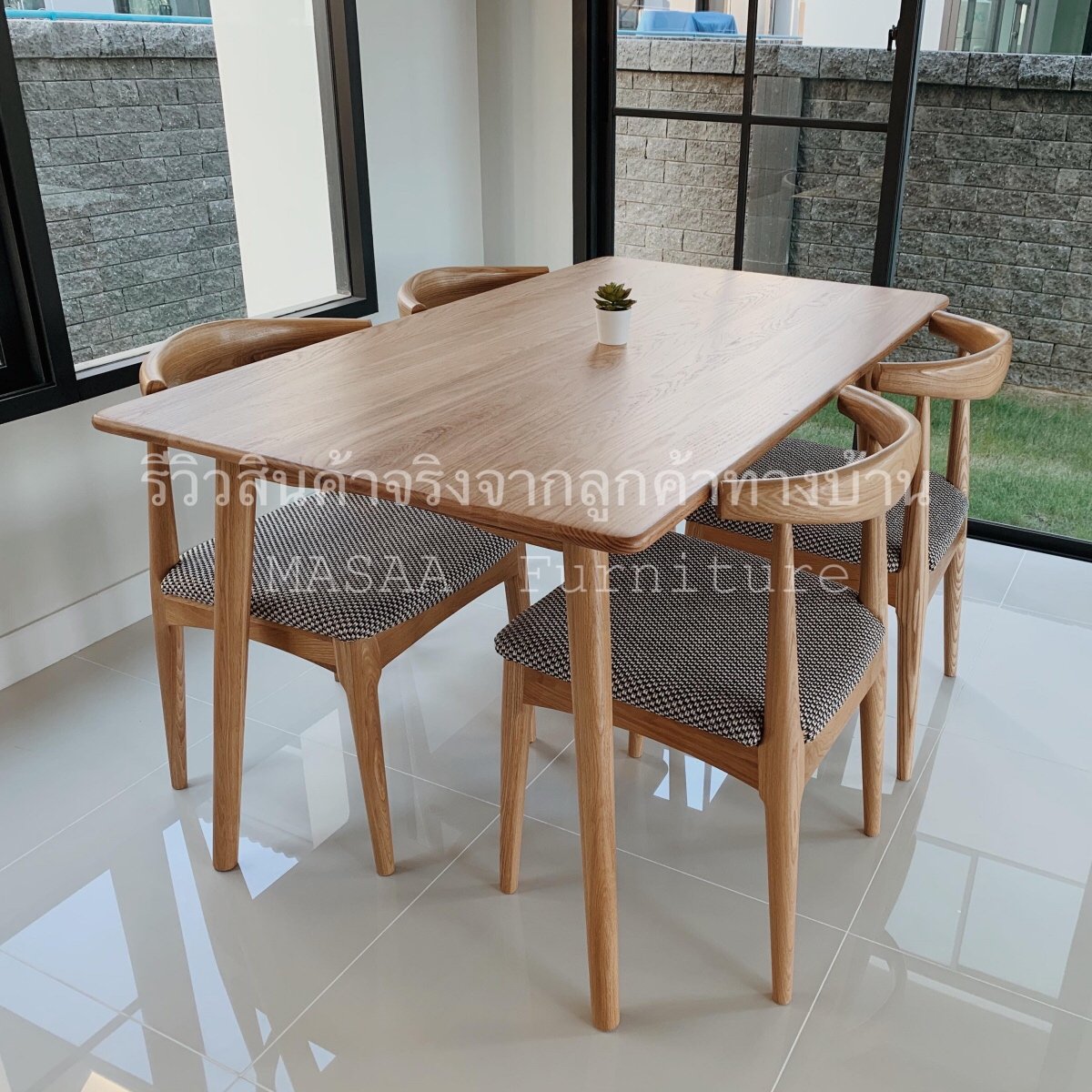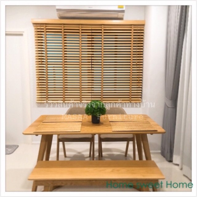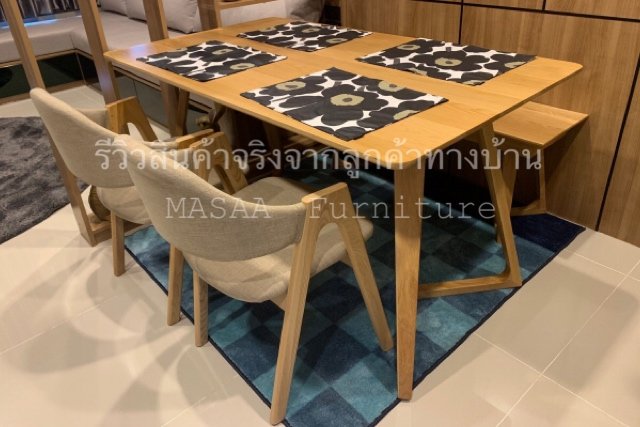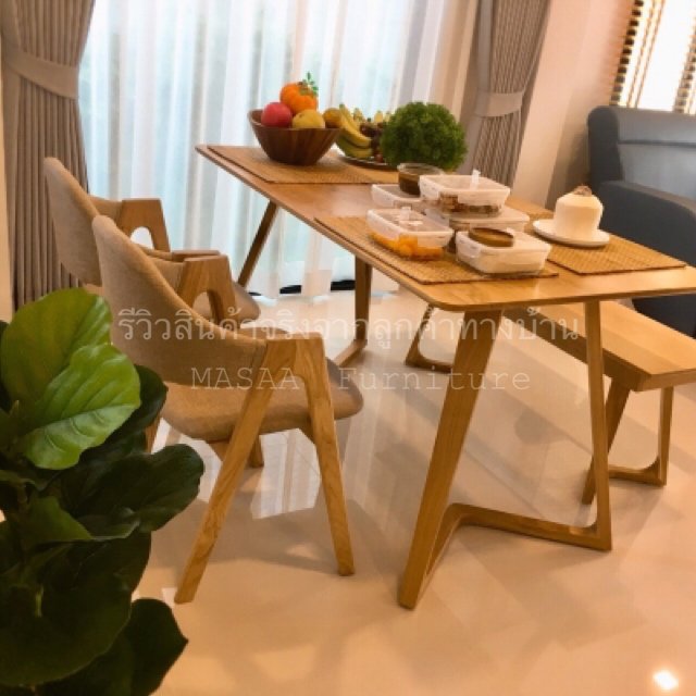 <ชุดโต๊ะกินข้าวไม้โอ๊ค ขาแบน DT004 ขนาด 1.6 เมตร พร้อมม้านั่งยาวไม้โอ๊ค ขาวี LB001 และเก้าอี้ไม้โอ๊ค Samurai DC007>