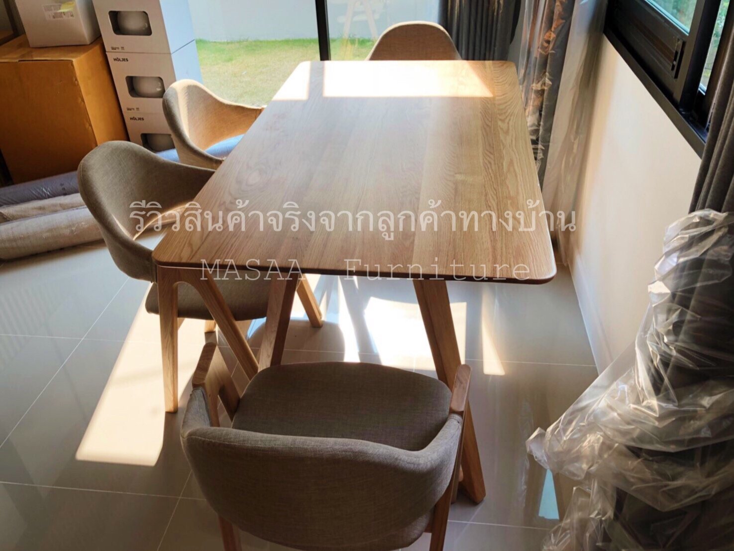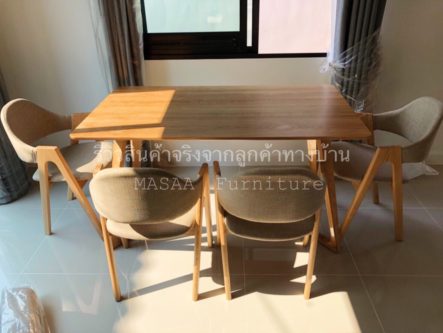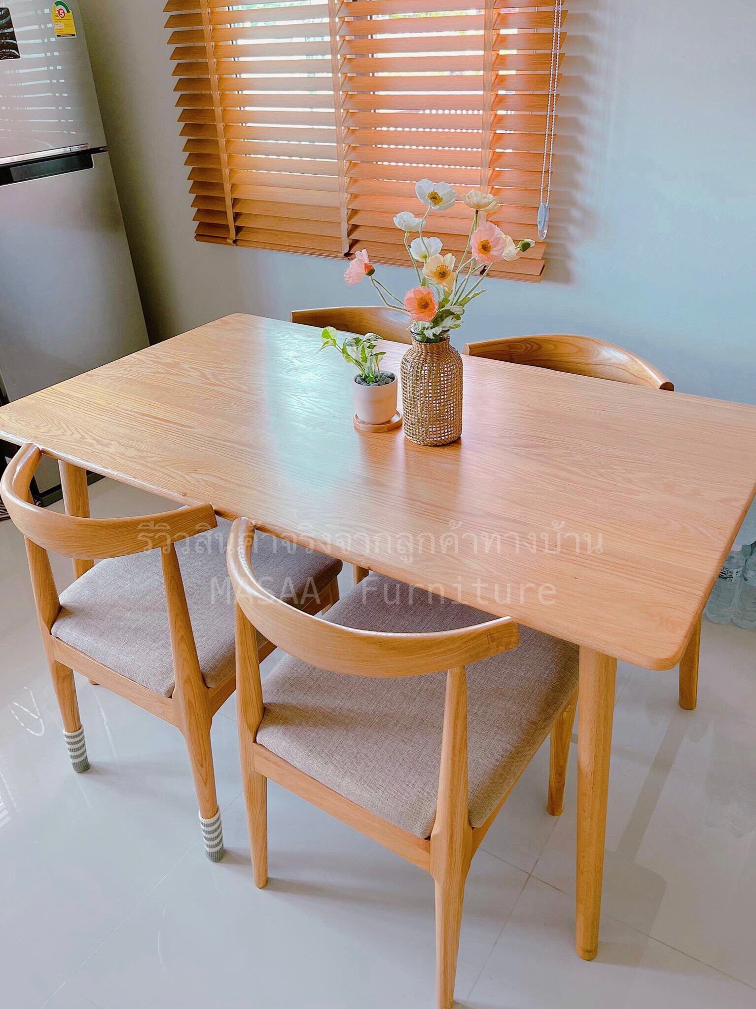 <ชุดโต๊ะกินข้าวไม้โอ๊ค สี่เหลี่ยม ขาแบน DST002 พร้อมเก้าอี้ไม้ A-Style DC001>