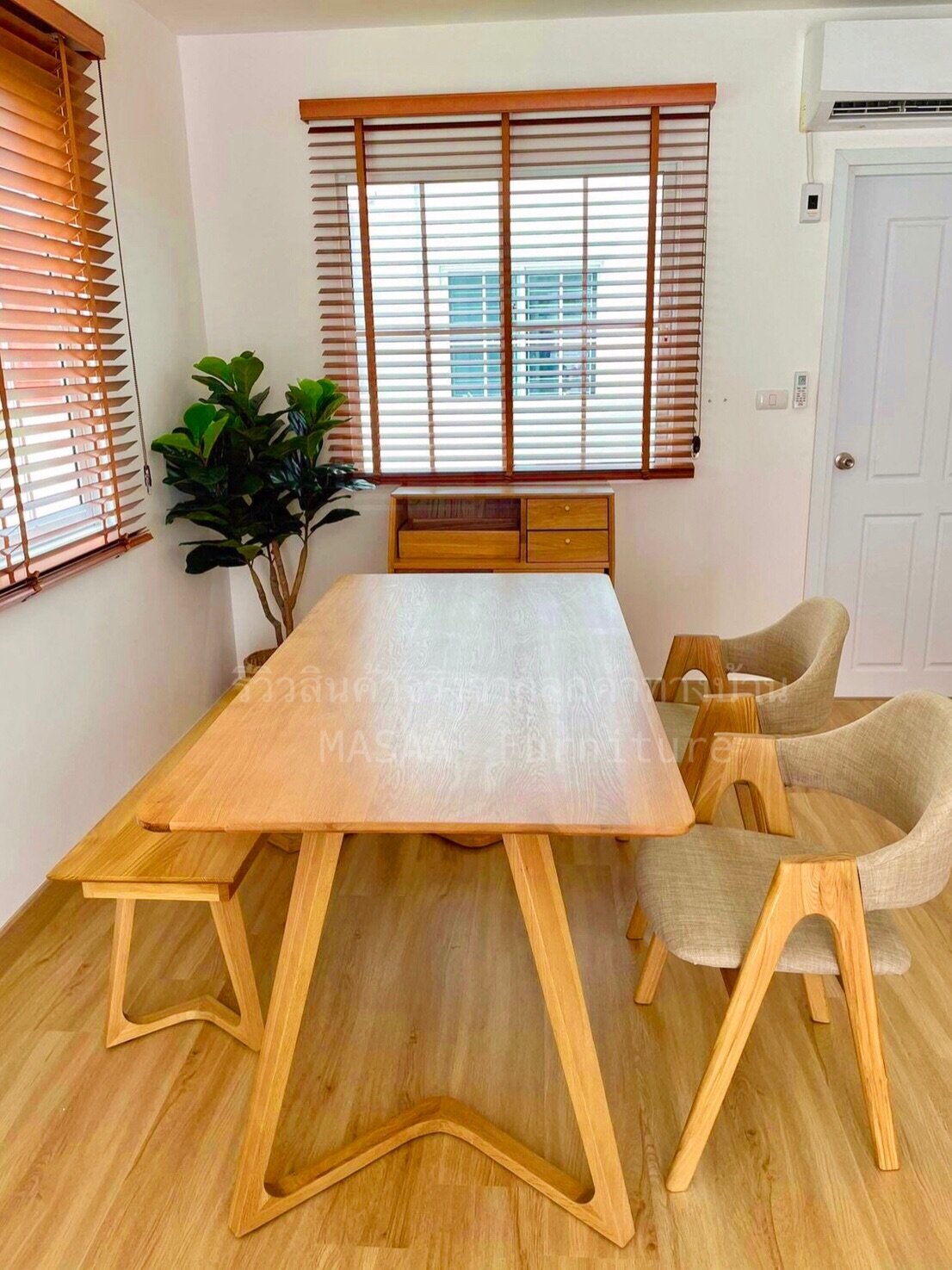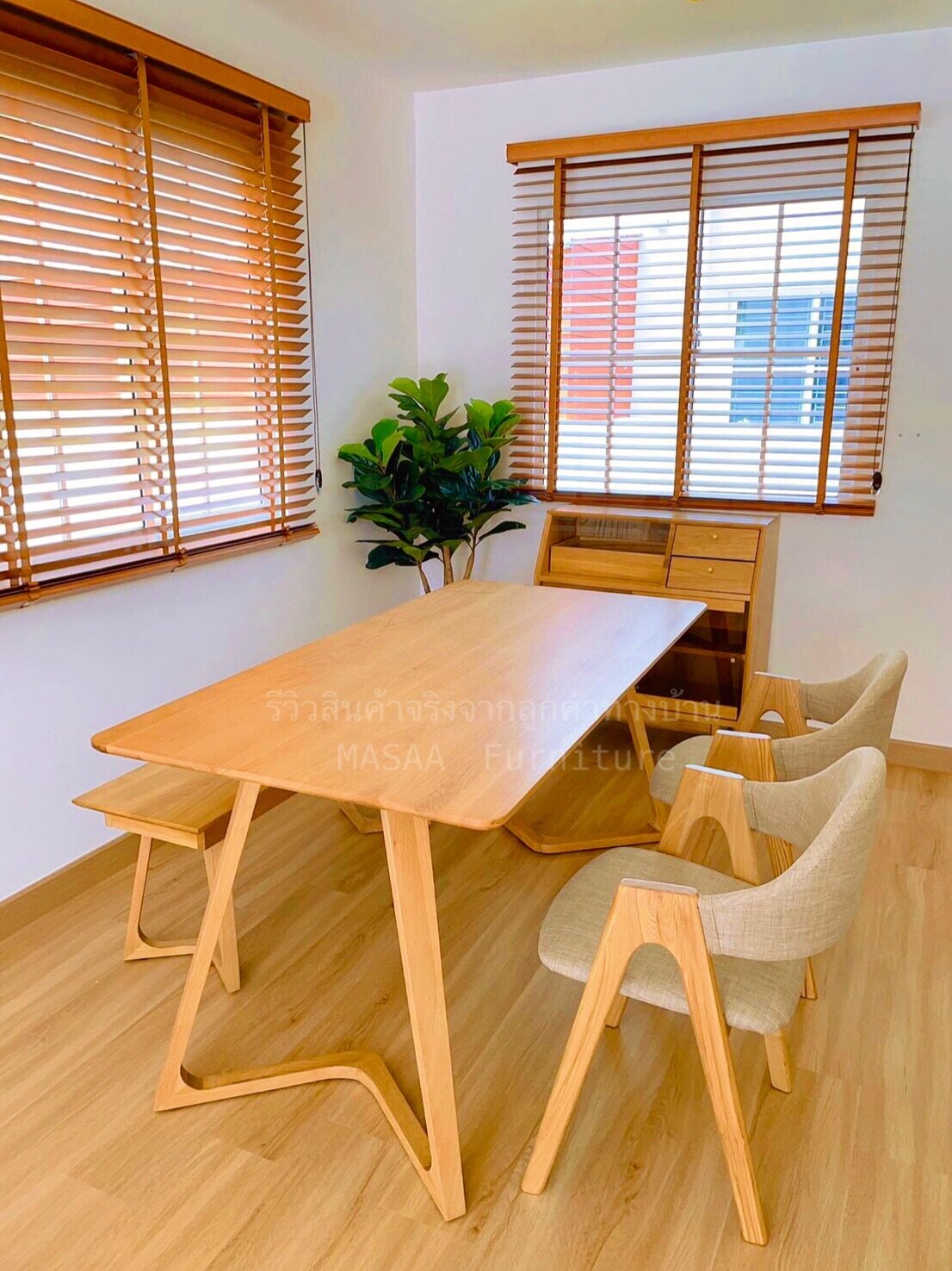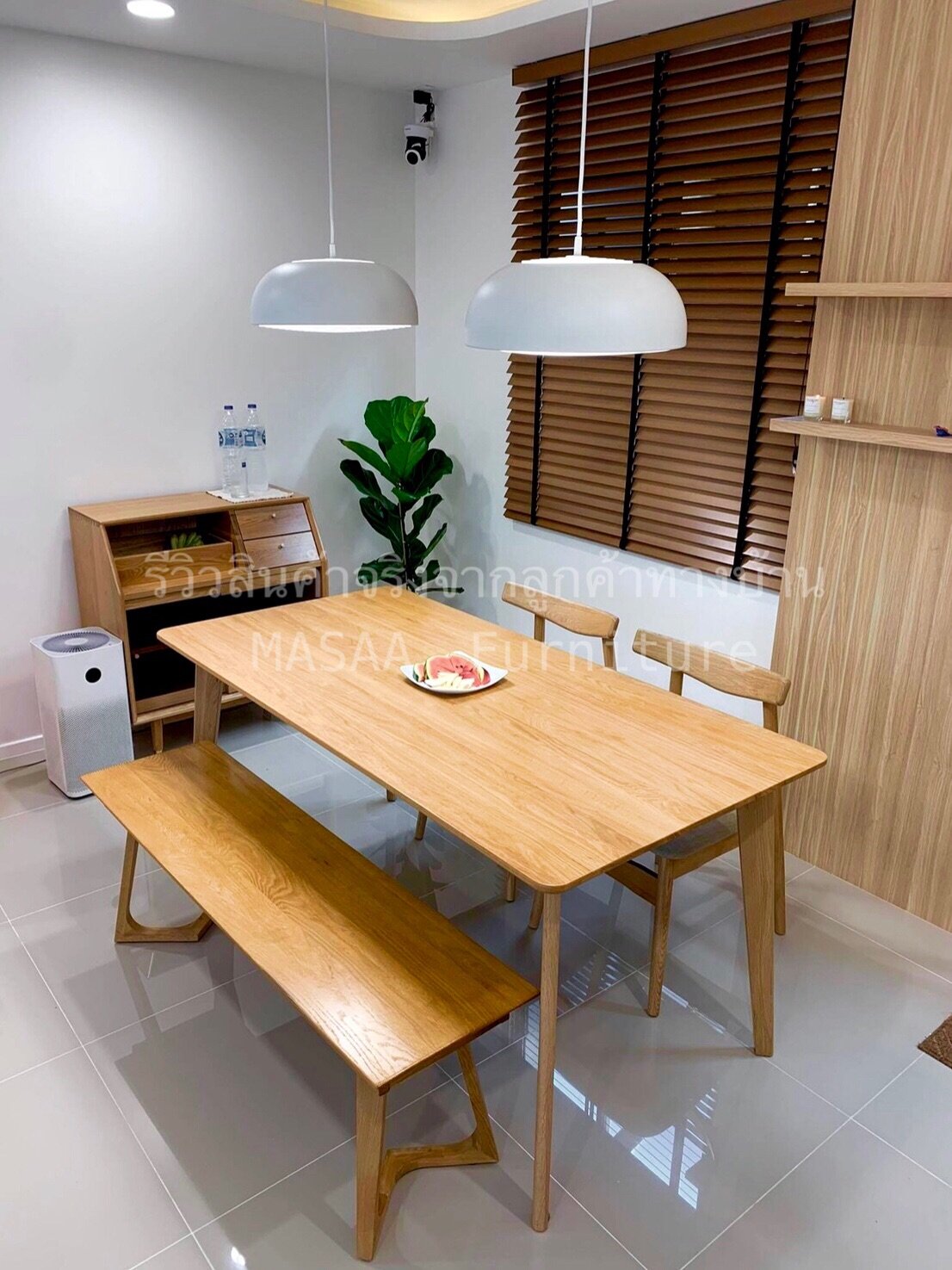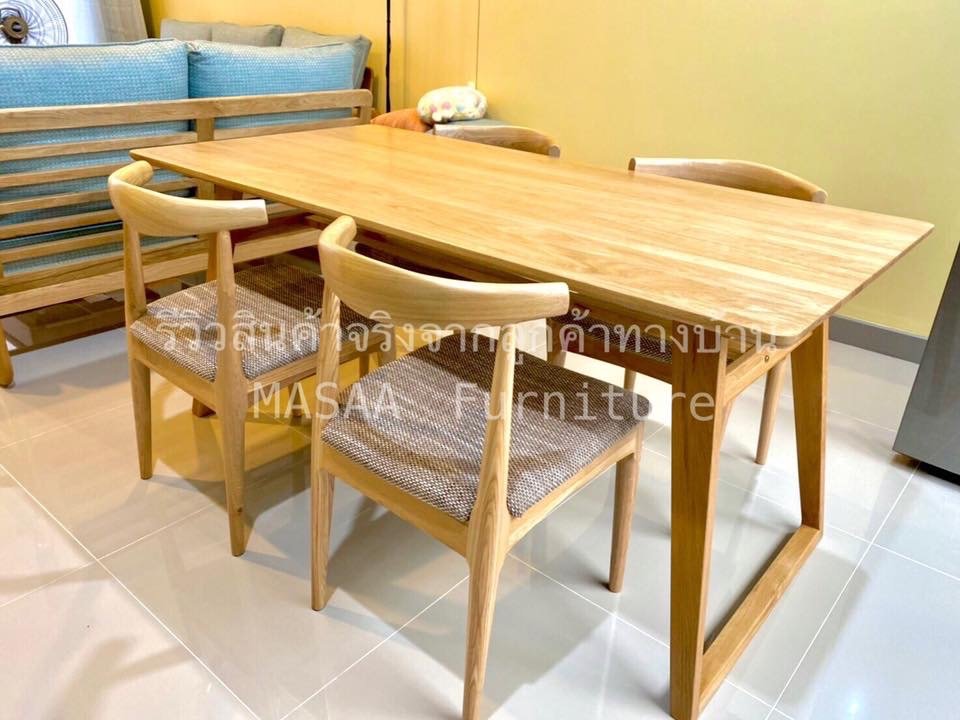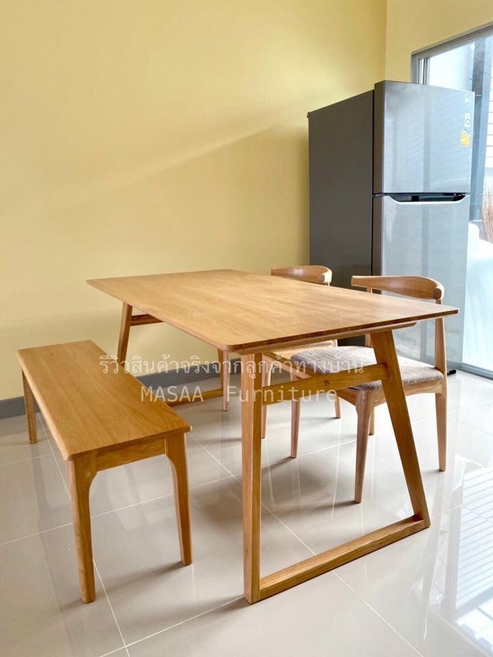 <ชุดโต๊ะกินข้าวไม้โอ๊ค ขาวี ขนาด 1.4 เมตร DT001 พร้อมม้านั่งยาวไม้โอ๊ค ขาวี LB001 และเก้าอี้ไม้ A-Style DC001>