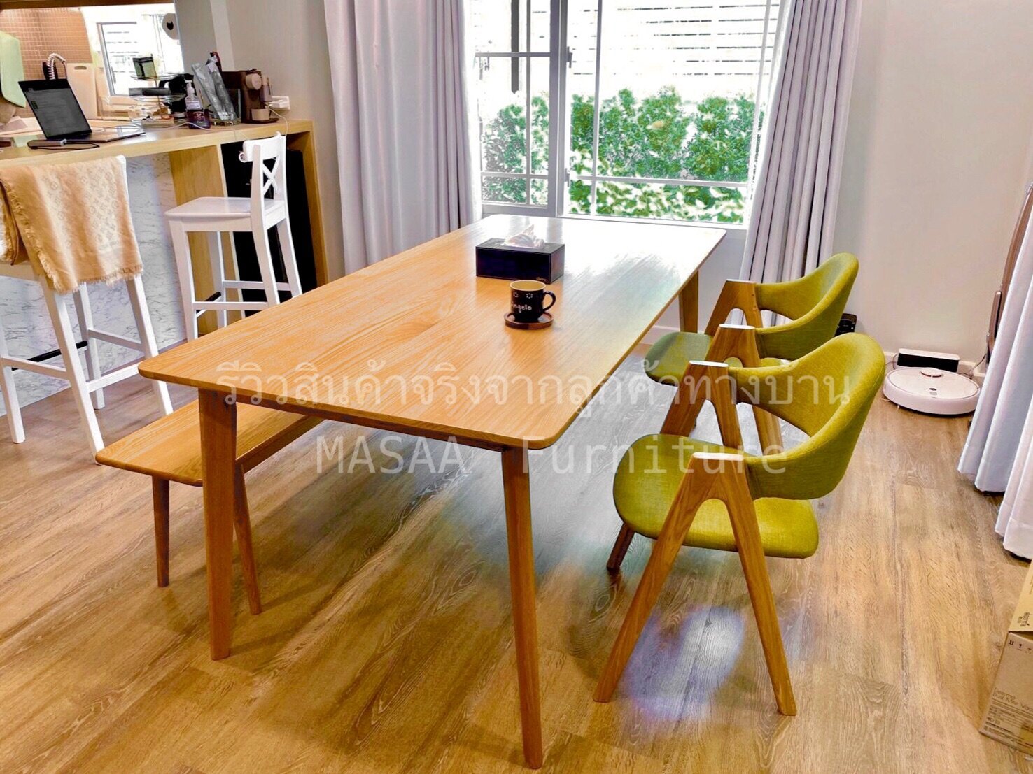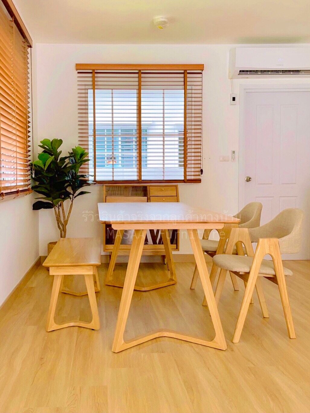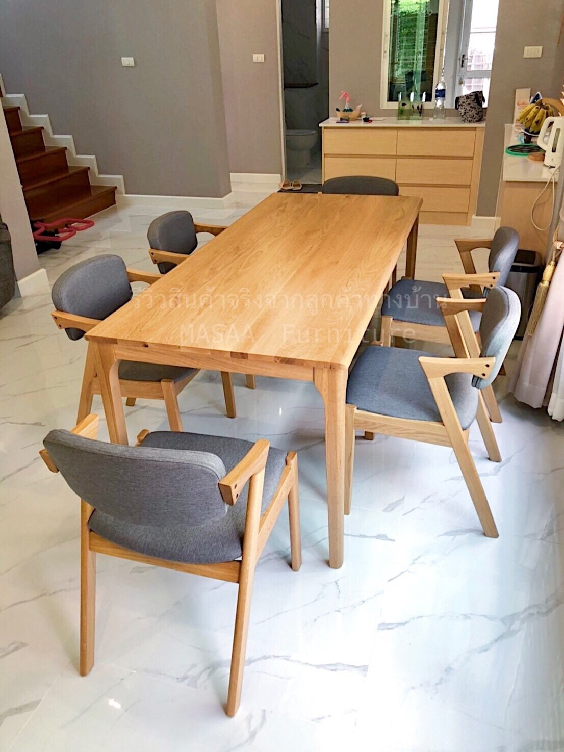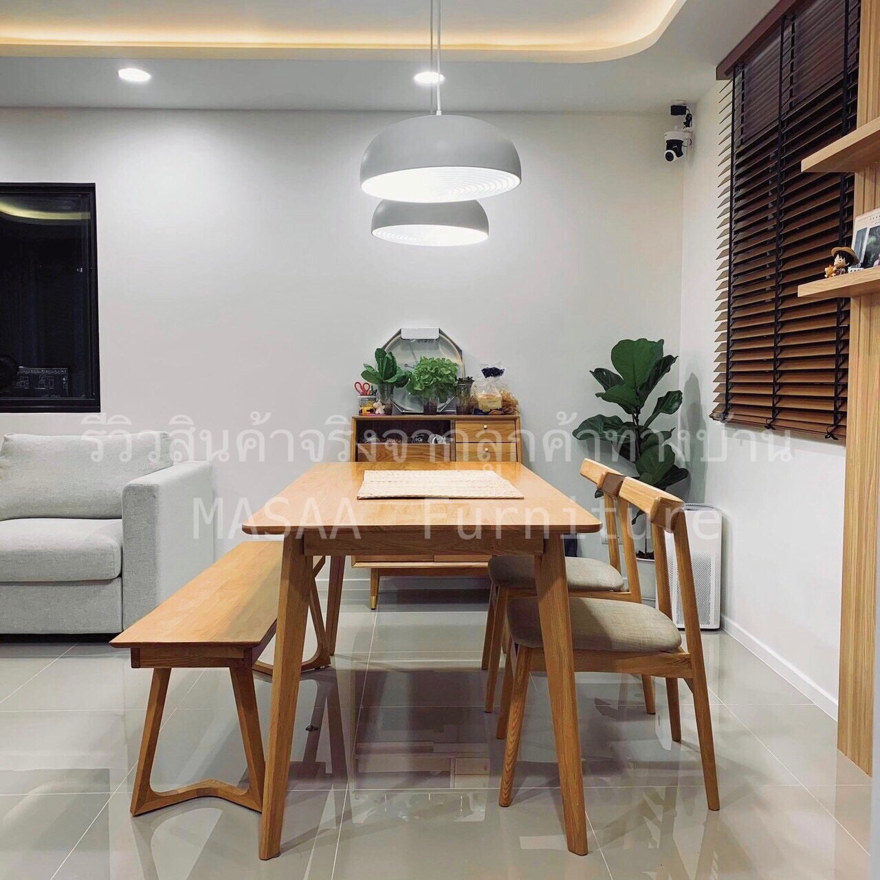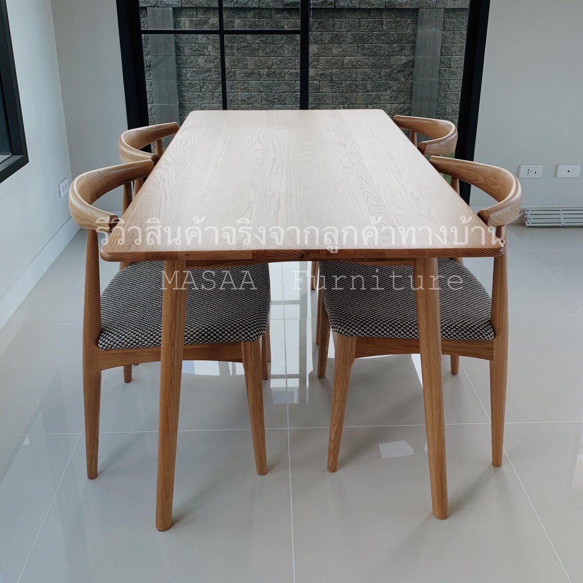 <ชุดโต๊ะกินข้าวไม้โอ๊ค ขาวี ขนาด 1.4 เมตร DT001 พร้อมม้านั่งยาวไม้โอ๊ค ขาวี LB001 และเก้าอี้ไม้ A-Style DC001>