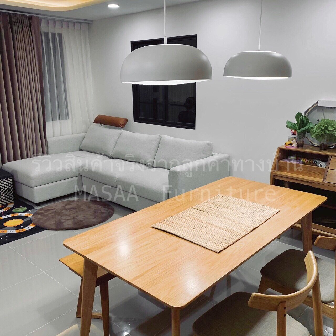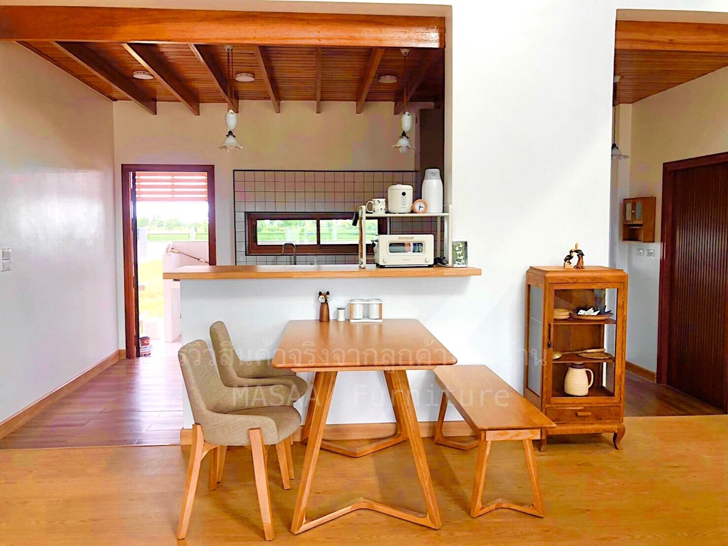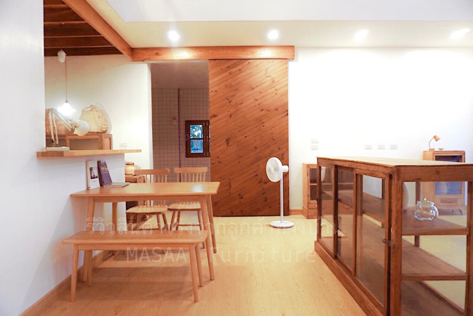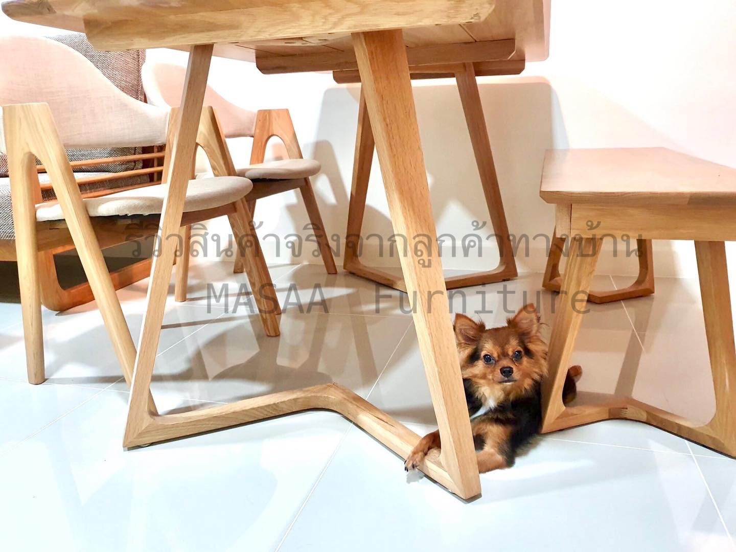<ชุดโต๊ะกินข้าวไม้โอ๊ค ขาวี ขนาด 1.4 เมตร DT001 พร้อมม้านั่งยาวไม้โอ๊ค ขาวี LB001 และเก้าอี้ไม้ A-Style DC001>