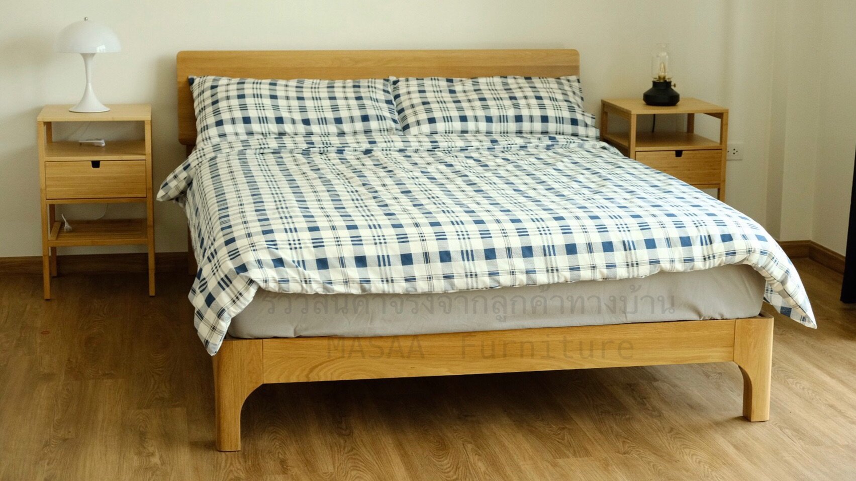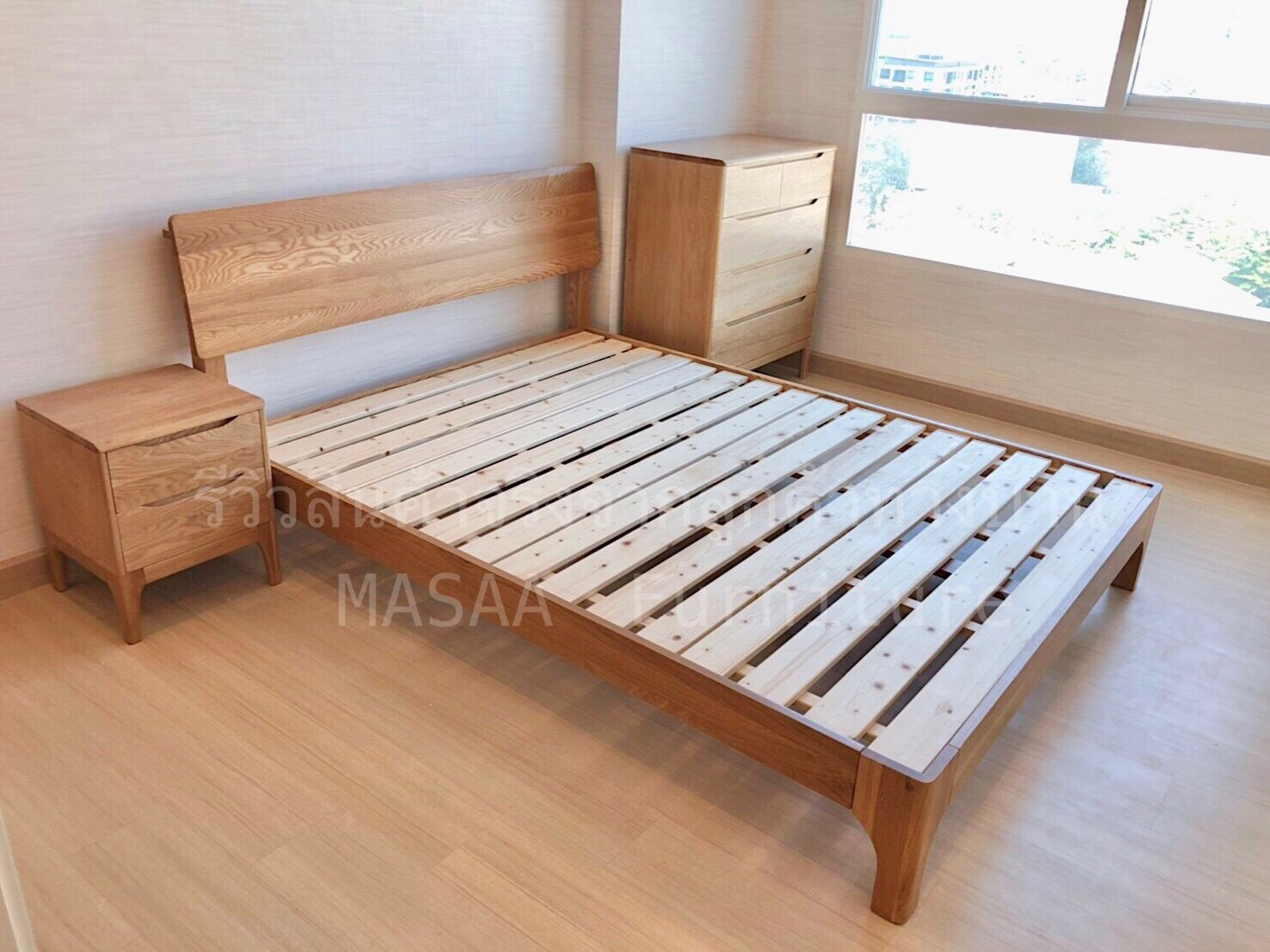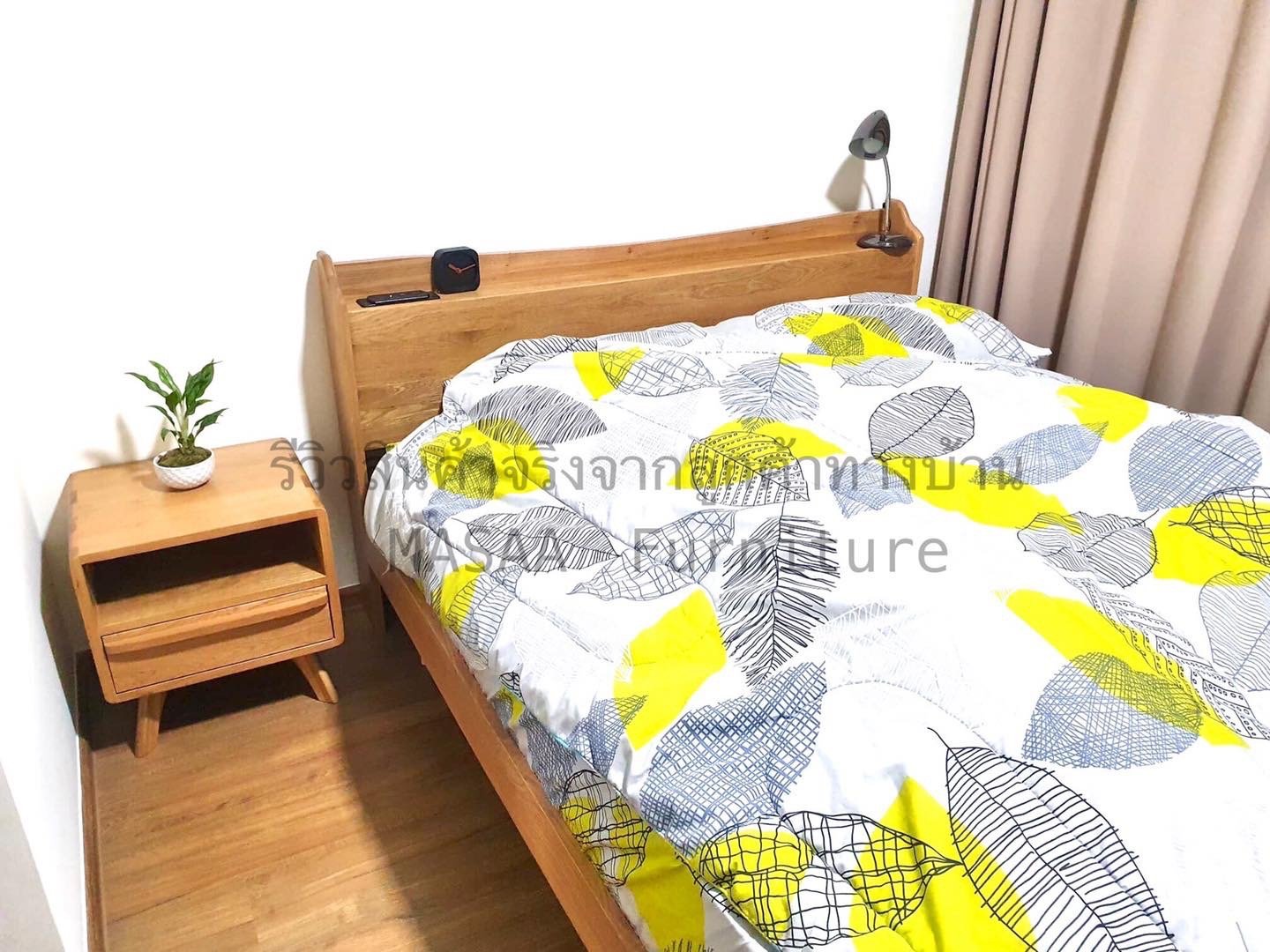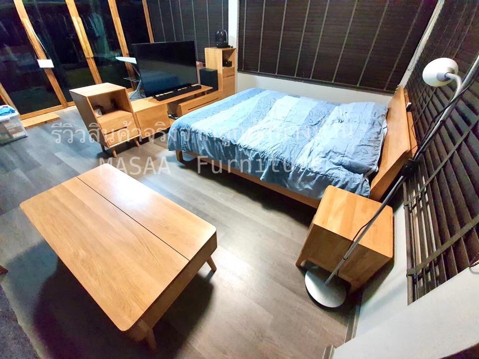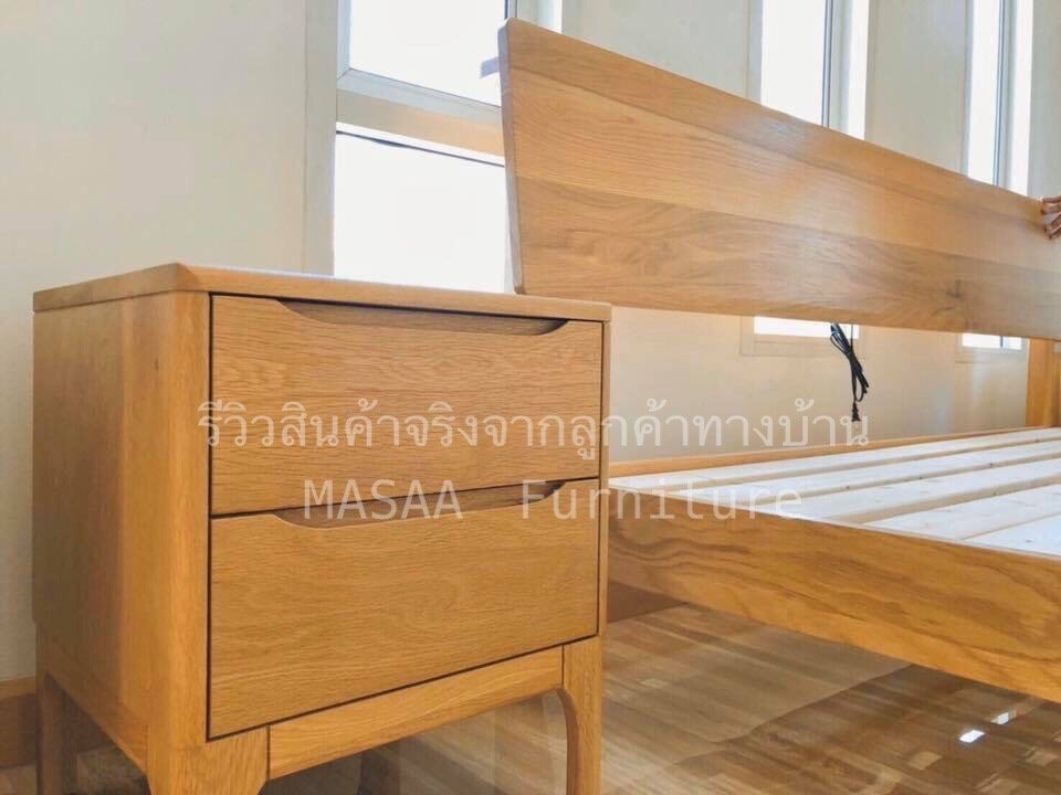 <ชุดเตียงนอนไม้โอ๊ค BED002 รุ่น Peninsula 6 ฟุต พร้อมตู้ข้างเตียงไม้โอ๊ค BT003 รุ่น Robot