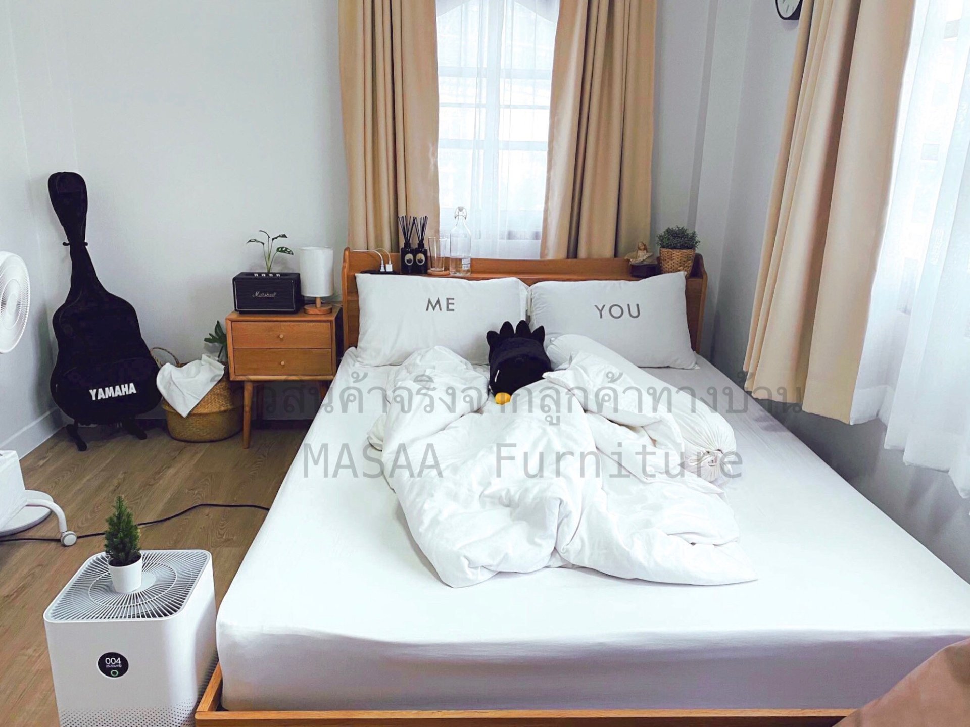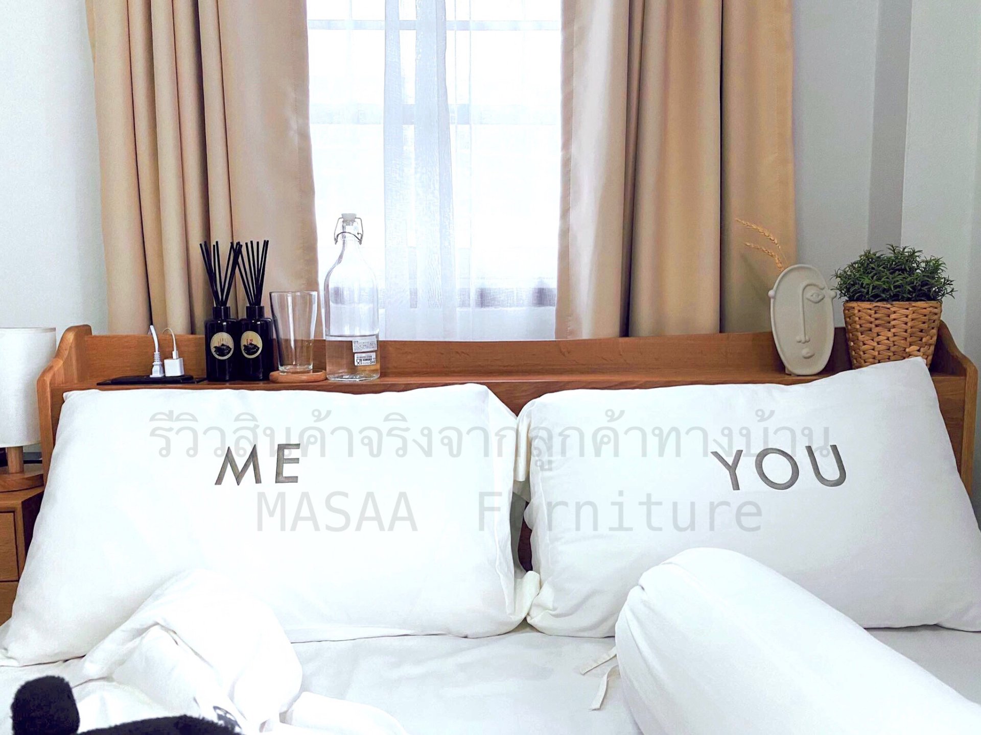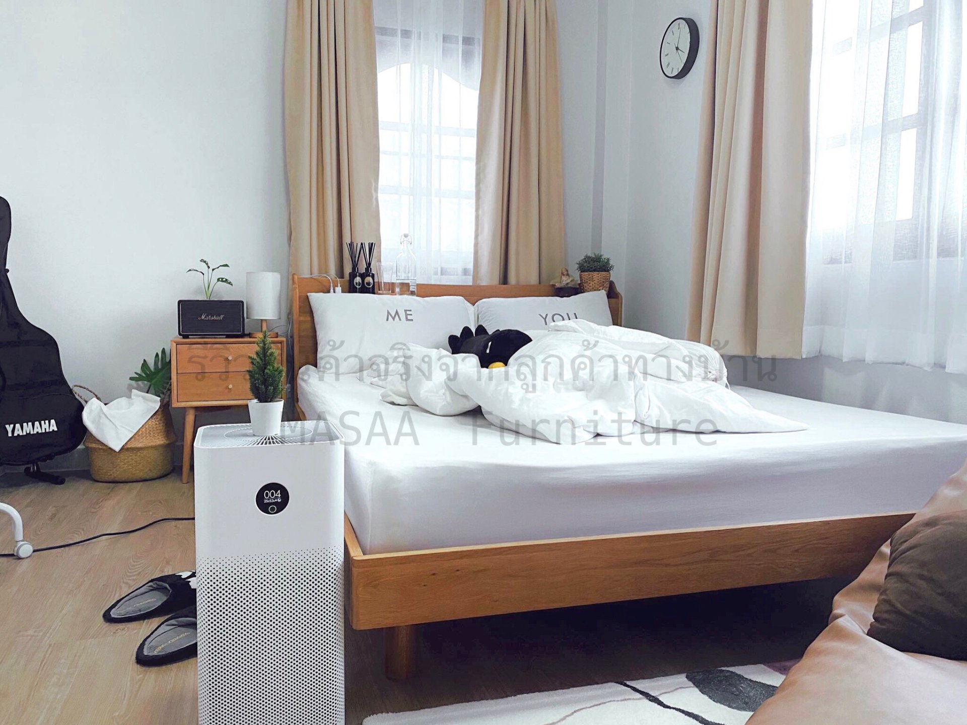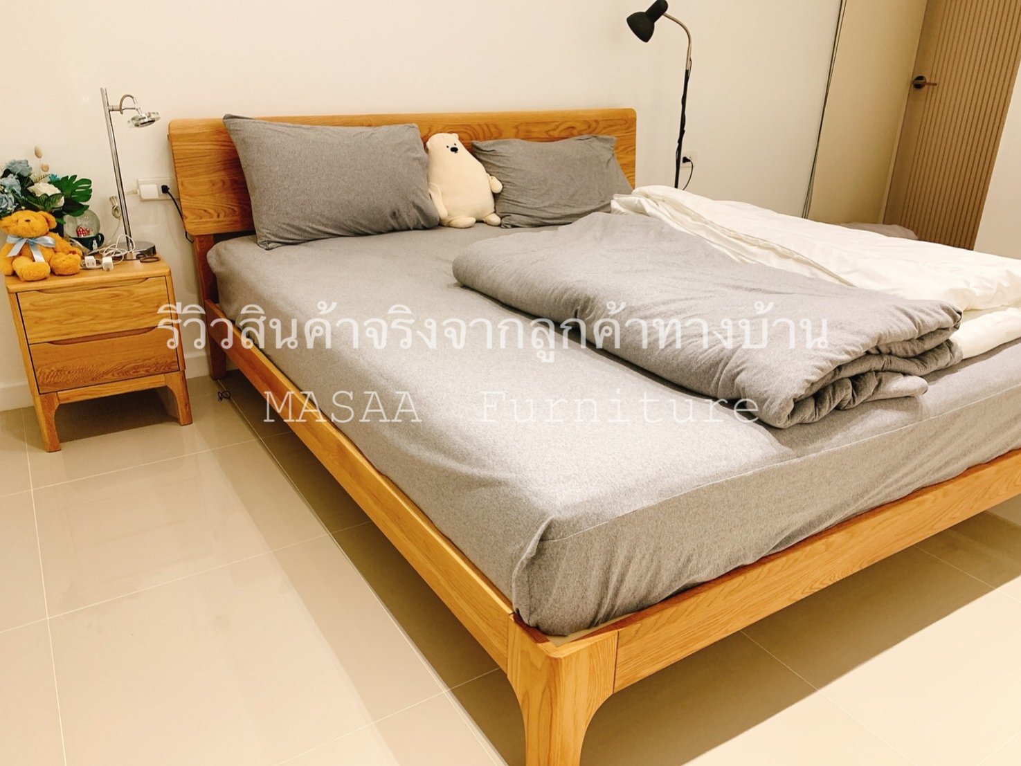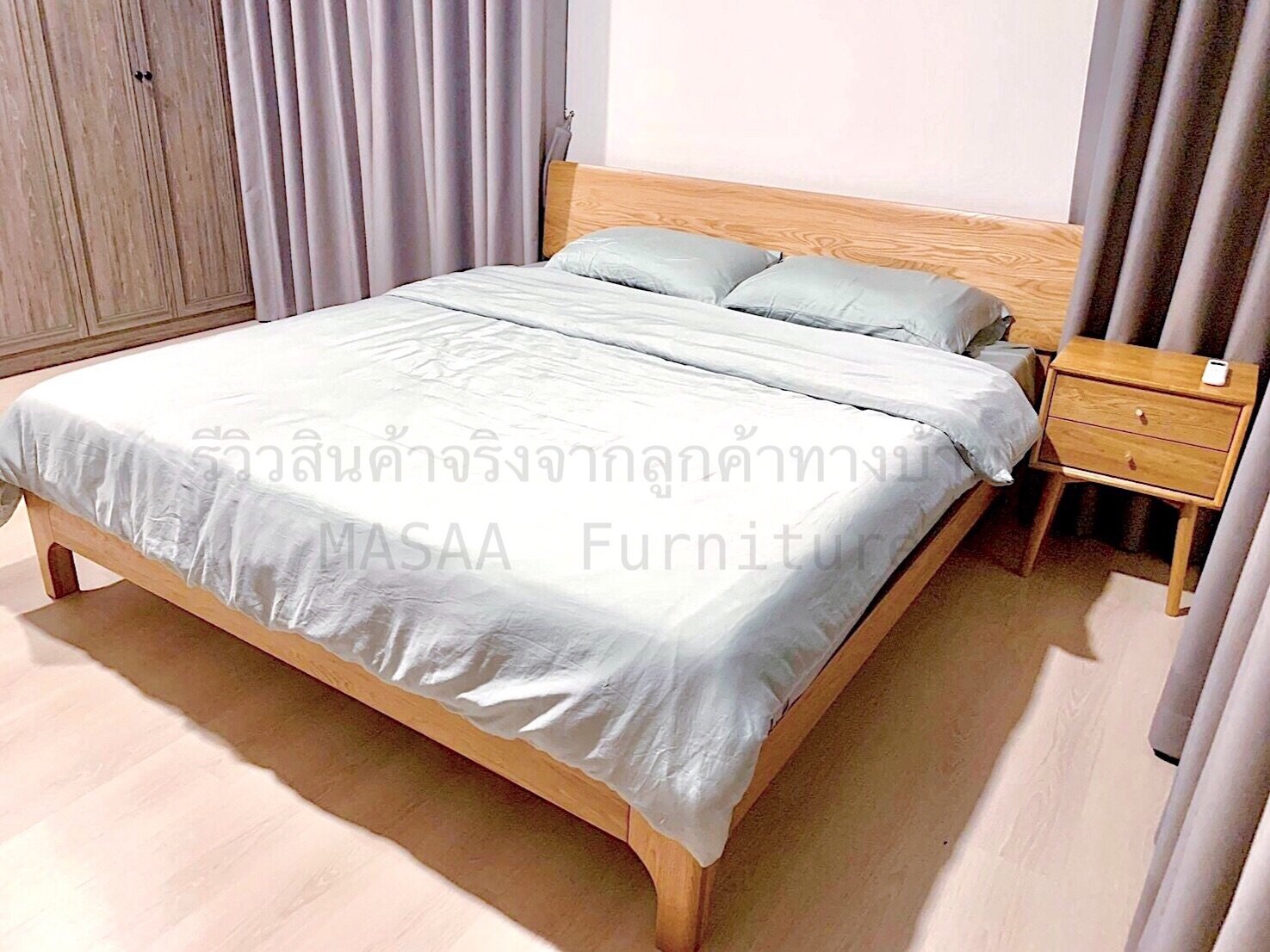 <ชุดเตียงนอนไม้โอ๊ค BED002 รุ่น Peninsula 6 ฟุต พร้อมตู้ข้างเตียงไม้โอ๊ค BT003 รุ่น Robot