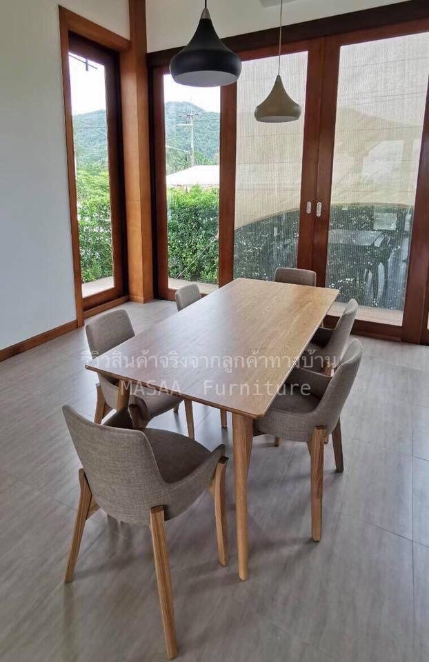 <ชุดโต๊ะกินข้าวไม้โอ๊ค ขากลม DT005 1.4 เมตร พร้อมเก้าอี้ไม้ Okinawa DC004>