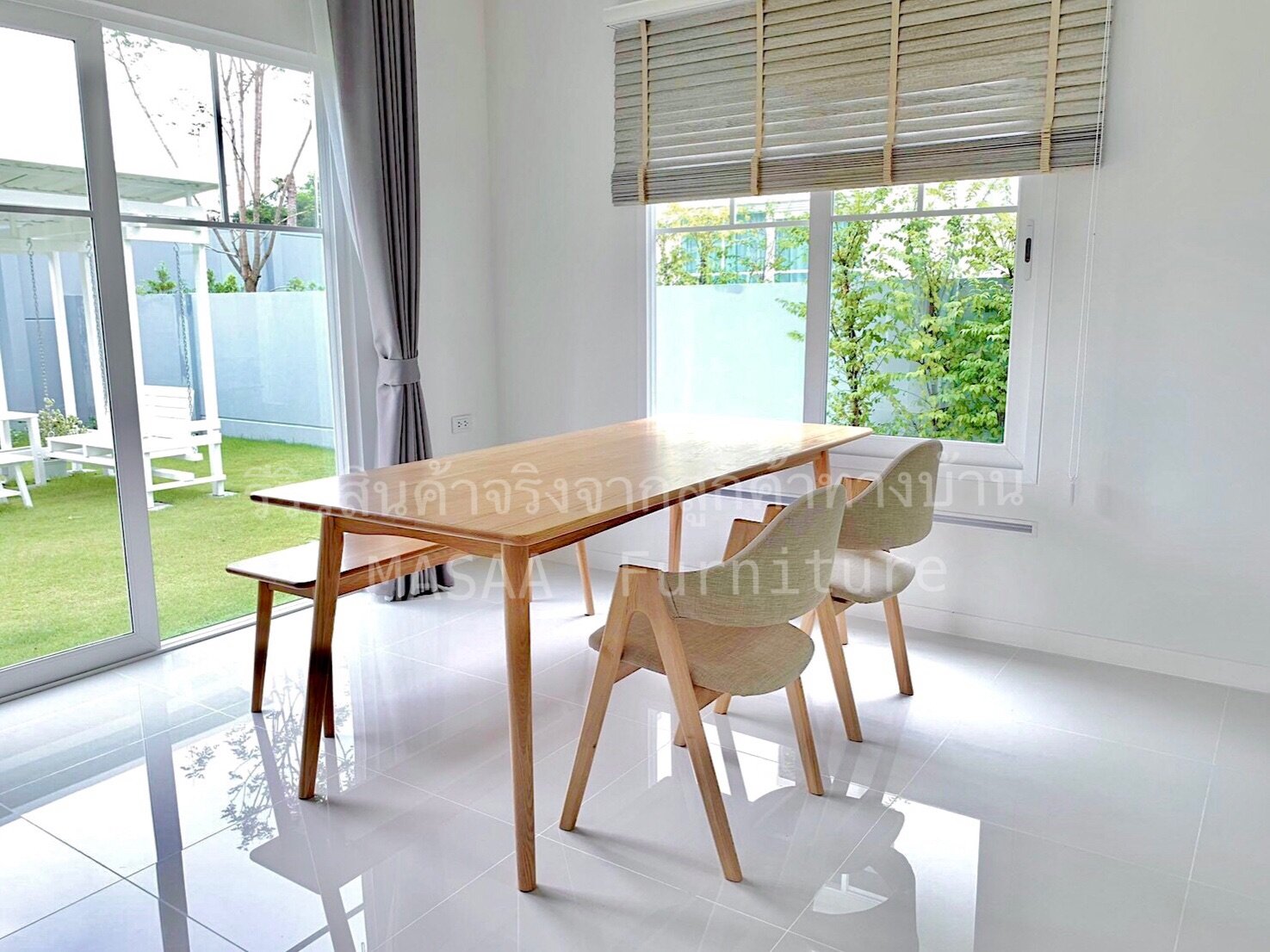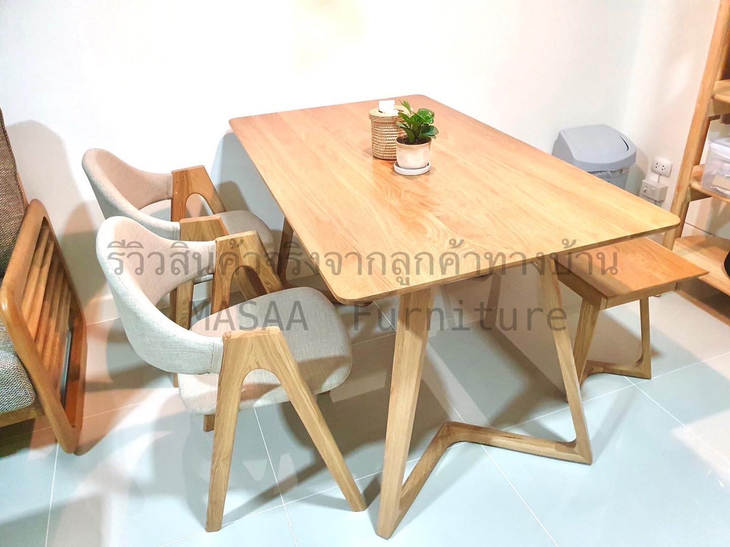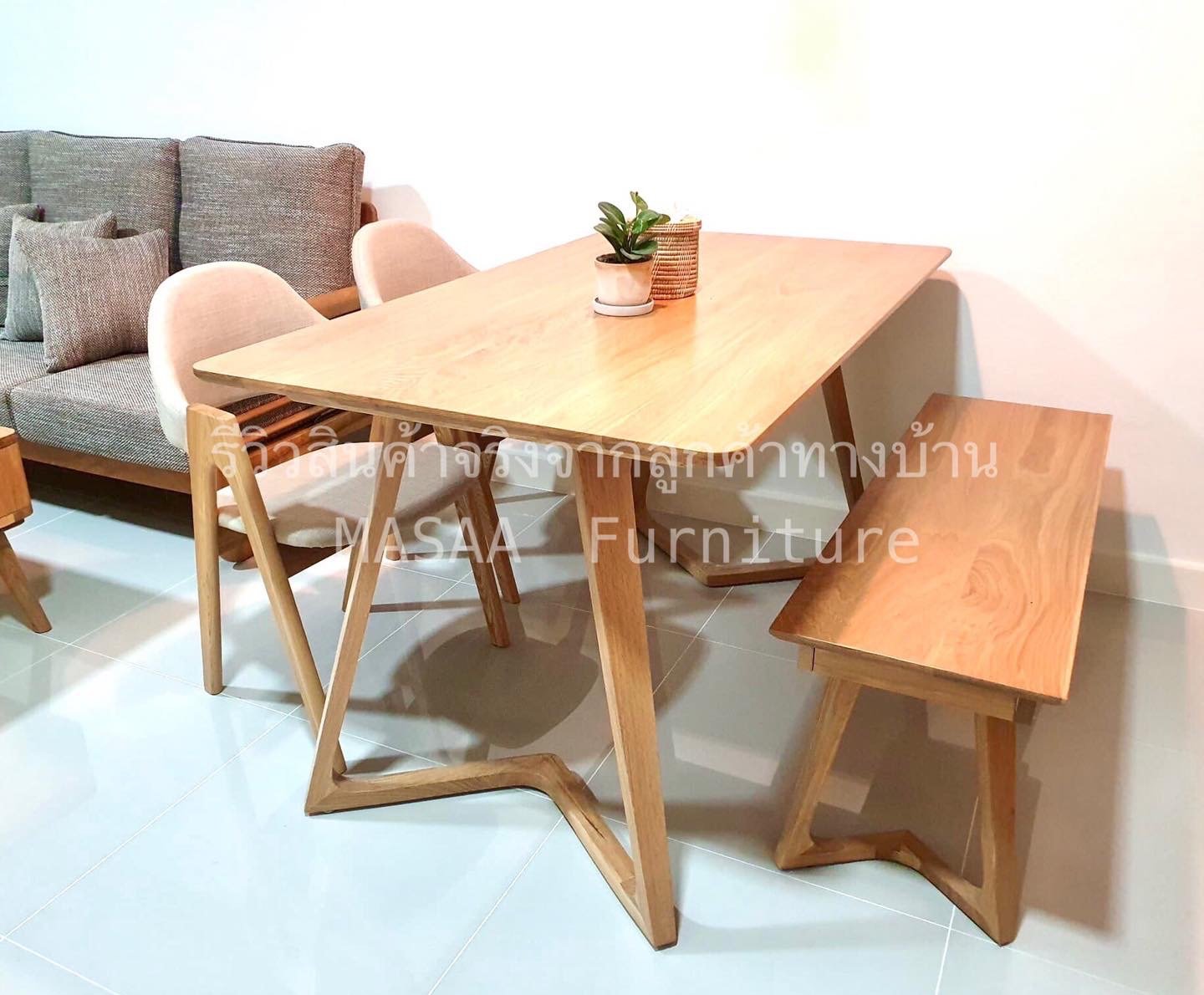 <ชุดโต๊ะกินข้าวไม้โอ๊ค ขาวี SETDL001 ขนาด 1.6 เมตร พร้อมม้านั่งยาวไม้โอ๊ค ขาวี LB001 และ เก้าอี้ไม้ A-Style DC001 x 2 ตัว>